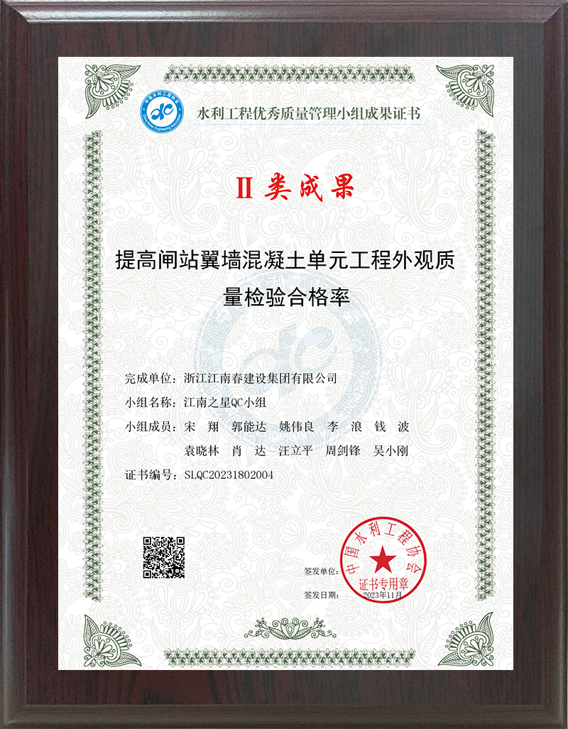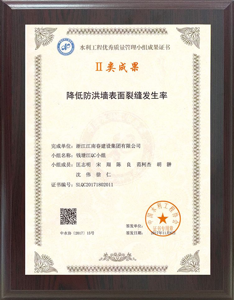 水利工程優(yōu)秀質(zhì)量管理小組成果證書 II類成果(降低防浪墻內(nèi)傾墻身蜂窩麻面發(fā)生率)