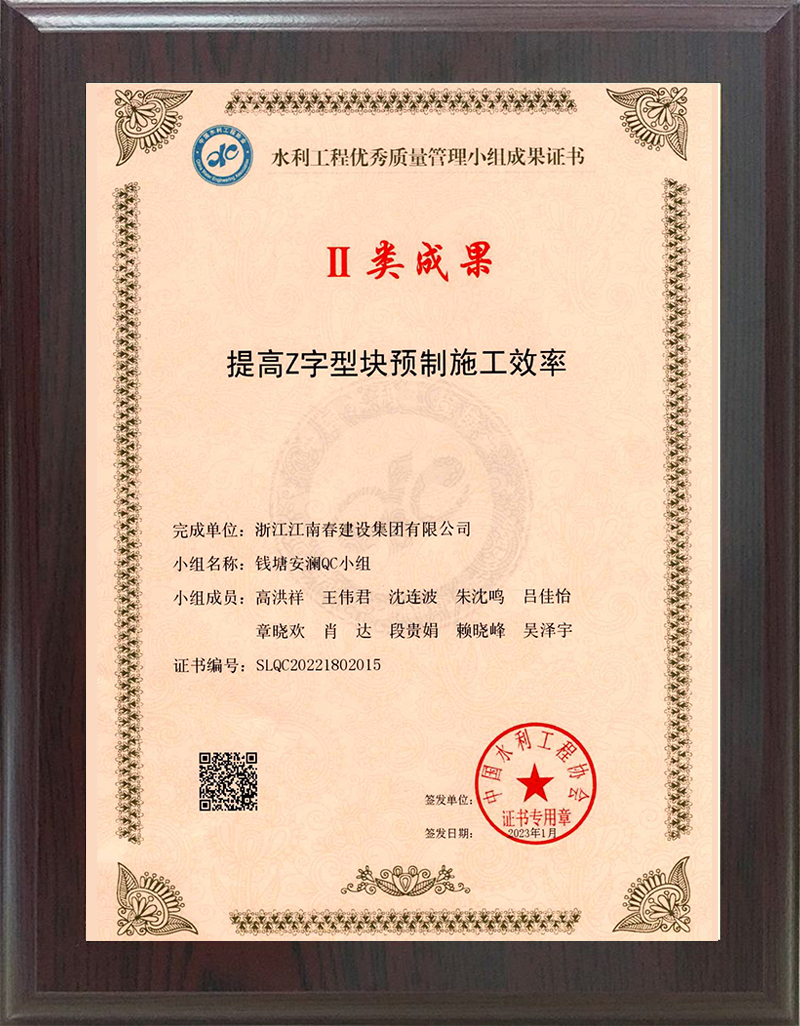 水利工程優(yōu)秀質(zhì)量管理小組成果證書 II類成果(提高預(yù)制六角塊安裝一次驗(yàn)收合格率)