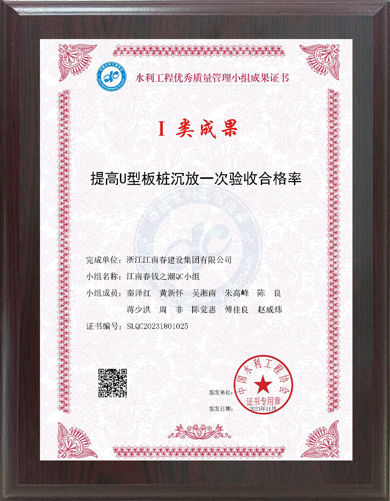 水利工程優(yōu)秀質(zhì)量管理小組成果證書 II類成果(降低防浪墻內(nèi)傾墻身蜂窩麻面發(fā)生率)